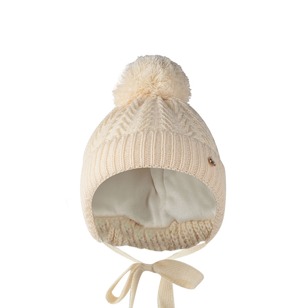 Шапка priKinder на завязках с помпоном и декоративной деталью молочная