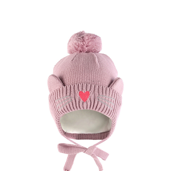 Шапка Prikinder на завязках с помпоном и декором ушки пудровая