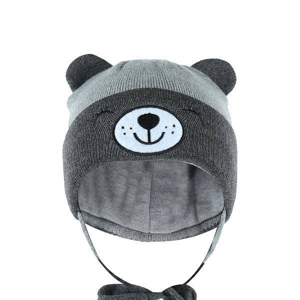 Удобная шапка органично впишется в сезонный гардероб маленького мальчика. Ее форма специально разработана с учетом анатомических особенностей и потребностей малыша. Небольшой отворот декорирован изображением забавной мордочки. Дополнительным декором служат смешные округлые ушки.
