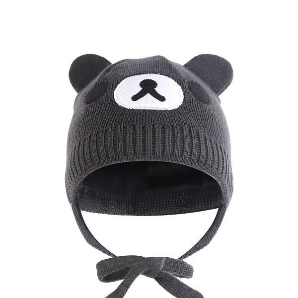Очаровательная шапка для мальчиков от «ПриКиндер» с ушами и мордой медведя. Головной убор на мягких лямках, которые можно аккуратно завязать под подбородком ребенка. Выполнен в темно сером цвете. На лицевой стороне пришиты изображения глаз и морды, а на макушке – объемные уши.