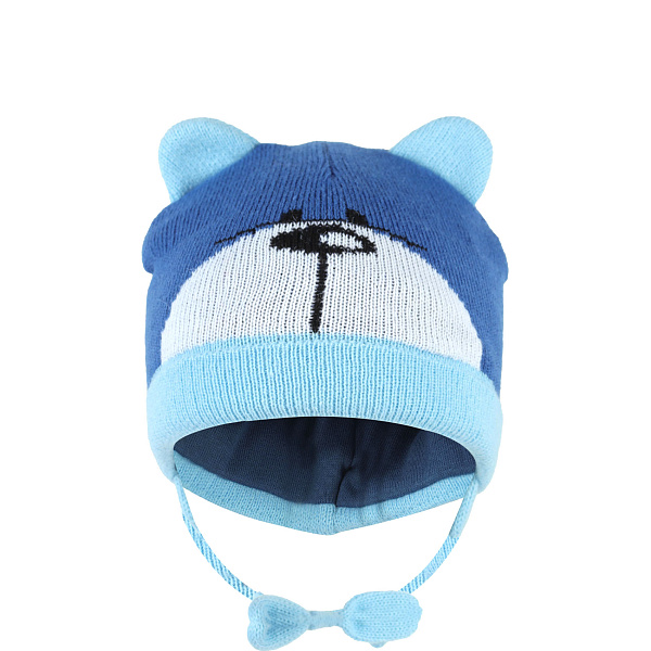 Верх шапочки имитирует мордочку медвежонка с глазками и носиком. Сверху пришиты декоративные ушки. Отворот шапки выполнен в голубом цвете, верх – чередование белого и синего оттенков, ушки – голубые. Аксессуар очень красиво смотрится на ребенке, он будет носить его с удовольствием.