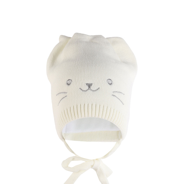 Шапка PriKinder с вышивкой котенок на завязках молочная