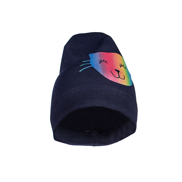 Модная и привлекательная шапка для маленьких девочек изготовлена из смесовых волокон с высоким содержанием хлопка и небольшим включением эластана. Практичный черный цвет разбавлен печатным изображением котенка в радужных тонах. Модель сшита в форме колпака, оставляющего небольшое свободное пространство над головой. Шапка подойдет для детей младшего возраста. Устойчивое крашение ткани долго сохраняет первоначальный вид изделия и не дает ткани линять. Шапка чудесно держит форму, сохраняет голову ребенка сухой в процессе использования, не вырабатывает статическое электричество, не спутывает волосы.