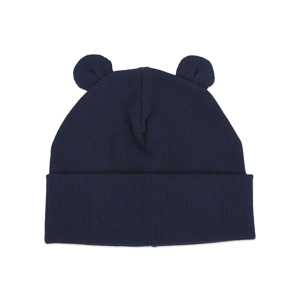 В качестве основного тона выбран привлекательный тёмно-синий цвет. Чтобы детскому образу придать оригинальность, в фасоне применён декор в виде медвежьих ушек. Наружная и внутренняя часть однотипные. При изготовлении использована двойная трикотажная вязка. Материал обладает отличной воздухопроницаемостью, не создает парниковый эффект. Он отлично отстирывается от загрязнений, быстро сохнет.