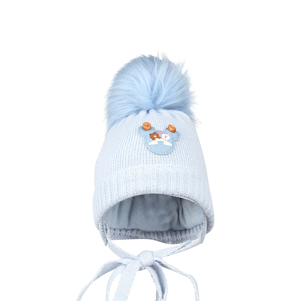 Разнообразьте гардероб маленького непоседы утепленной шапкой небесного цвета. Верх головного убора пошит из смеси шерсти и акрила, материалы хорошо сохраняют тепло и приятно прилегают к телу. Подкладка, изготовленная из натурального хлопка, мягкая на ощупь и не пропускает холодный воздух. Утеплитель из синтепона. Макушка украшена пушистым помпоном в тон шапке. Область ушей закрыта и дополнена длинными завязками. Эластичный вязаный манжет по низу шапки добавляет элегантность в образ головного убора. Завершает дизайн нашивка с кроликом и медвежонком. Пушистая голубая шапка защитит голову ребенка от холодного ветра и органично сочетается со светлыми и темными вещами.