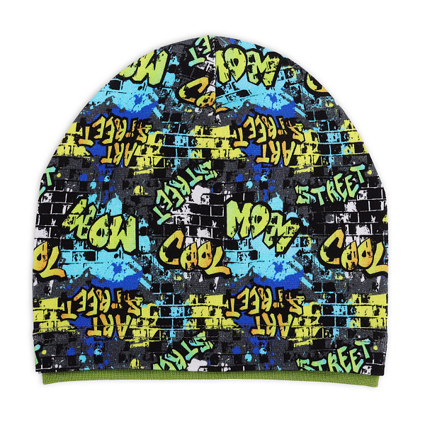 Модная шапка органично дополнит сезонный гардероб ребенка, позволит ему с комфортом прогуляться в прохладную погоду. Головной убор привлекает внимание сочетанием контрастных цветов и рисунками в стиле граффити. Модель имеет простой крой, дополнена трикотажной резинкой по нижнему краю для плотного прилегания. Изделие бережно облегает голову, не оказывает внешнего давления, не смещается на глаза во время активных игр.