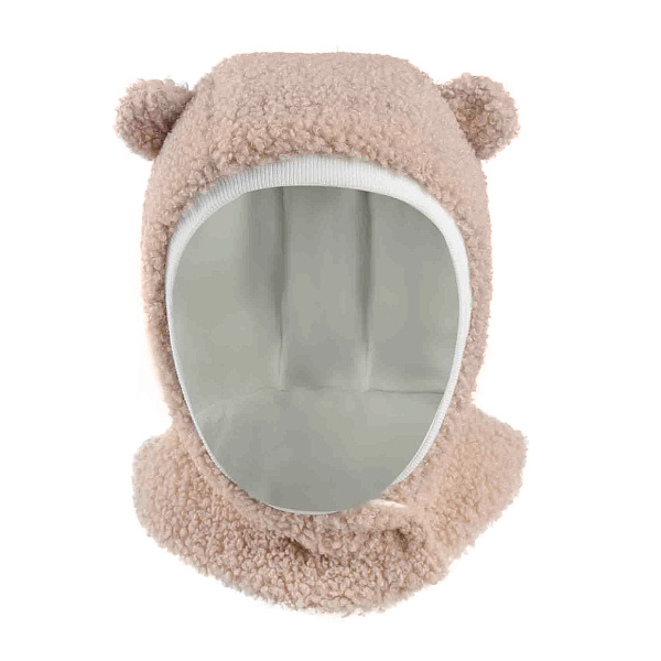 Шапка-шлем бежевого цвета согреет девочку в самые холодные дни. Форма покрывает голову, уши и шею. Шапка надевается легко и надежно фиксируется на липучку. Часть на шее облегает кожу. Шапку украшают милые ушки.
