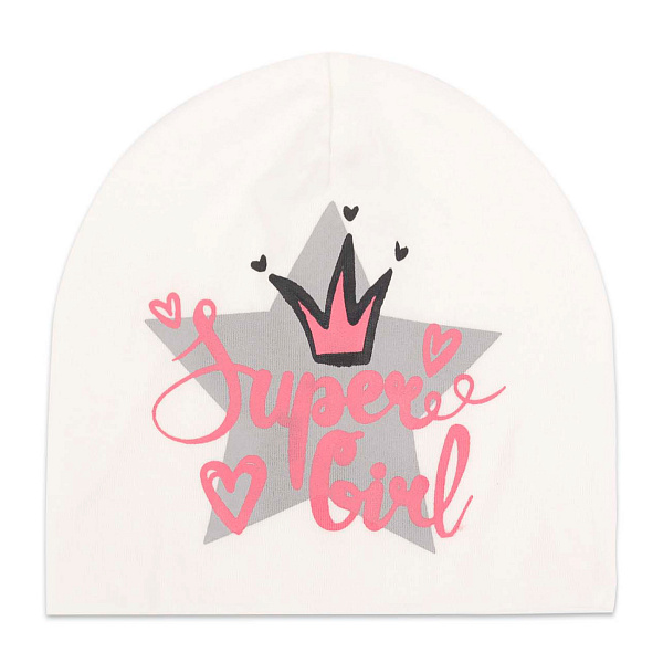 Белоснежная шапка декорирована ярким контрастным принтом с изображением серой звезды, маленькой красной короны и надписи «Supergirl». Этот головной убор органично сочетается с одеждой любого стиля.