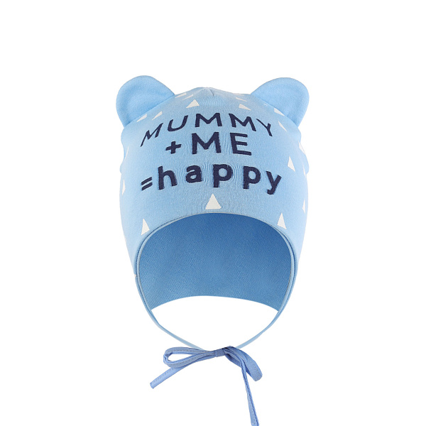 Шапка плотно прилегает к голове, хорошо защищает уши и шею и фиксируется на подбородке завязками. Она декорирована ушками по типу медвежьих, текстовым принтом в лобной части. Цветовое оформление – голубое с белыми декоративными треугольниками по всей поверхности.
