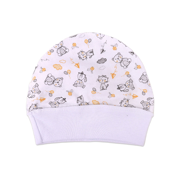Нежная цветовая гамма подойдет мальчику и девочке. Легкая шапочка предназначена для новорожденных, поэтому имеет наружные швы. Изделие хорошо сидит на голове, не смещается, не сползает на глаза. Мягкий трикотаж изготовлен из 100% натурального хлопкового волокна. Он соответствует всем гигиеническим и санитарным требованиям, не ограничивает естественный теплообмен и циркуляцию воздуха. Ткань хорошо впитывает влагу, не растягивается, легко отстирывается, быстро сохнет. Головной убор долго сохраняет привлекательность и первоначальную форму, может использоваться на улице и дома.