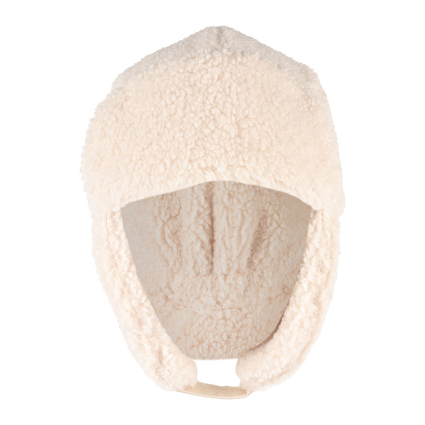 Детская шапка кремового цвета выполнена из мягкого и теплого материала полиэстера, идеально подходящего для холодного времени года. Внешняя поверхность имеет текстуру меха, создавая дополнительный уют и защиту от ветра и холода.