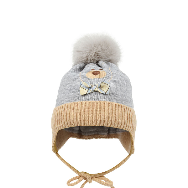 Забавная двухцветная шапка станет украшением в зимнем гардеробе ребенка. Верх головного убора пошит из смеси натуральной и искусственной шерсти, материалы не мнутся, устойчивы к износу и эффективно накапливают тепло. Подкладка из хлопка и эластана делает шапку мягкой и приятной к телу, поскольку материалы пропускают воздух и влагу. Утеплитель изготовлен из полиэфира. Низ шапки украшен бежевым вязаным манжетом, он плотно прилегает к голове и дополнительно утепляет область ушей и затылка. Длинные завязки плотно фиксируют головной убор. Верх шапки украшен пушистым помпоном и рисунком медведя с аккуратным бантом.