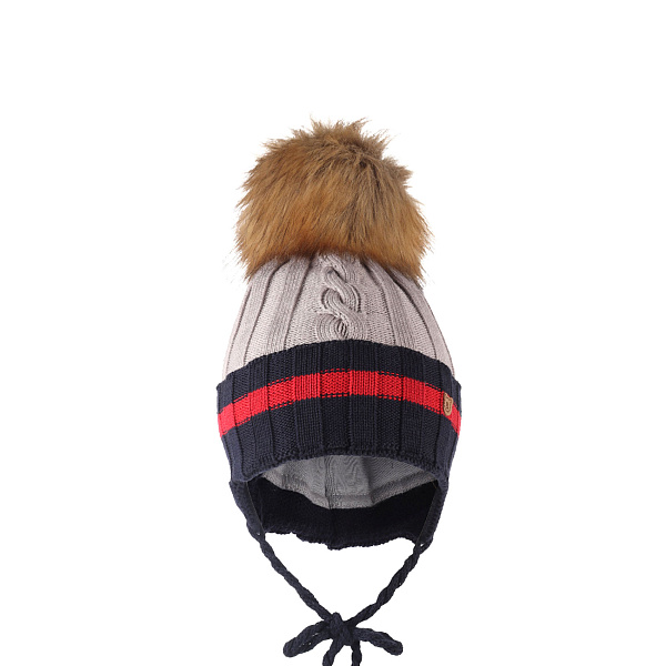 Шапка зимняя с помпоном с эмблемой на завязках трехцветная