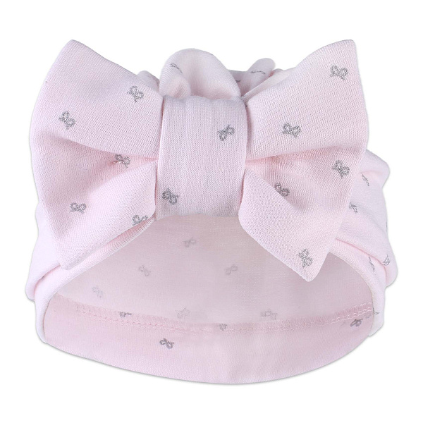 Дизайн шапочки отличается нежным розовым цветом с изысканным узором в виде маленьких бантиков. Основной акцент сделан на большом декоративном банте спереди, который добавляет изделию очарование. Удобная посадка и эластичность ткани обеспечивают надежную фиксацию на голове, не вызывая дискомфорта.