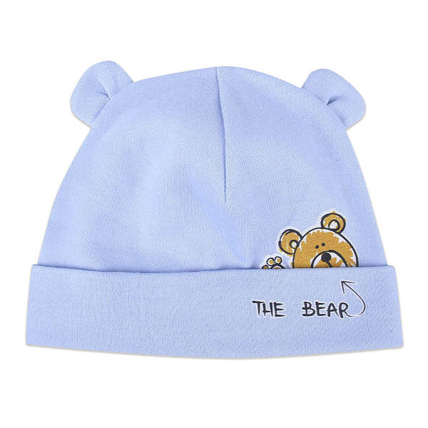 Шапочка трикотажная с отворотом ушками и рисунком мишки голубая