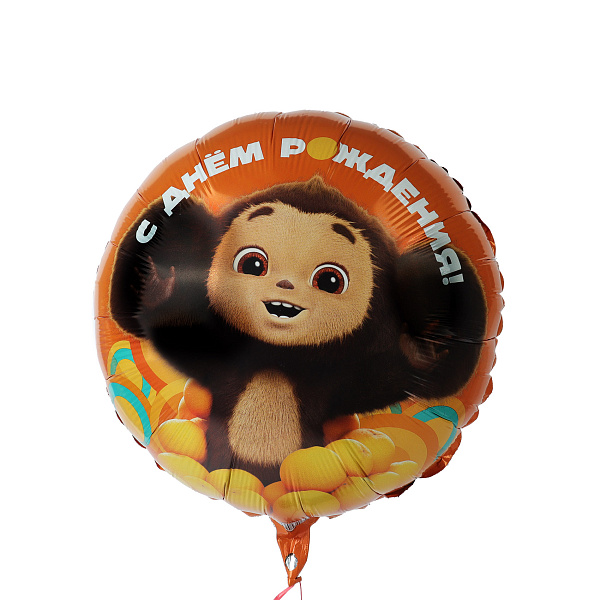 Юный именинник будет в восторге от необычного шара с изображением забавного Чебурашки. Герой популярного мультфильма радостно приветствует виновника торжества. В верхней части размещена поздравительная надпись, образующая дугу.