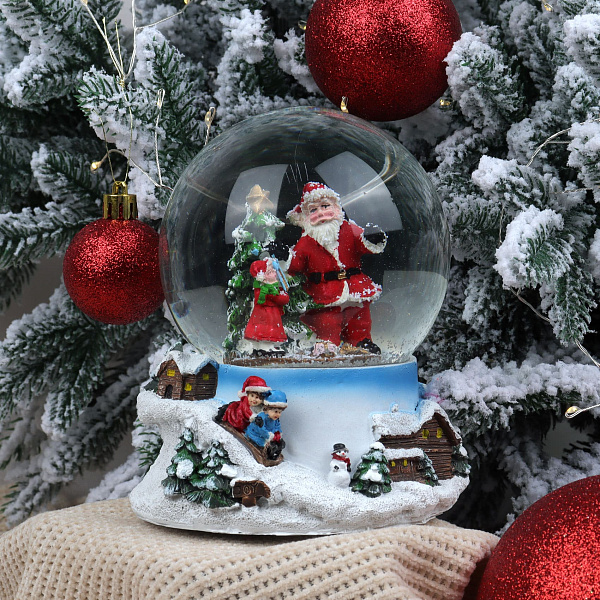 Шар снежный Дед Мороза с ребенком и елкой музыкальный стекло D10см