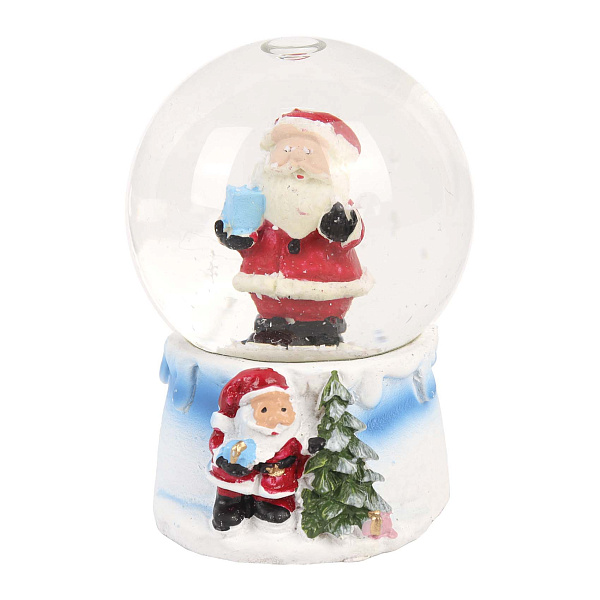 Подставка шара изготовлена из прочного пластика. На ней изображен Дед Мороз с украшенной елкой. Яркие, насыщенные цвета подставки создают контраст с белыми снежинками внутри купола, которые легко кружатся, если встряхнуть шар. Он может стать отличным украшением на полке или камине.