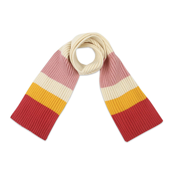 Шарф для девочки выполнен в светлом молочном оттенке с яркими разноцветными полосами — розовой, желтой и красной, которые создают веселый и уютный образ. Вязка выполнена в классическом ребристом стиле, что придает изделию дополнительный объем и обеспечивает приятную текстуру. Длина шарфа позволяет удобно обернуть его вокруг шеи, создавая надежную защиту от холода.