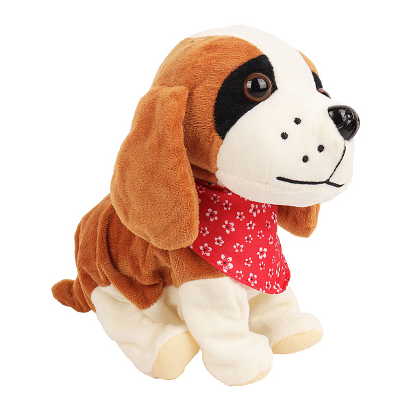 Интерактивный щенок бигля — мягкая игрушка, дарящая множество радостных моментов. Щенок выполнен в виде бигля с реалистичными ушами, носом и улыбчивой мордой. Мягкая ткань коричневого, белого и черного цветов придает игрушке правдоподобный вид. Красная бандана с белыми узорами добавляет очарование. Материал безопасны для детей.