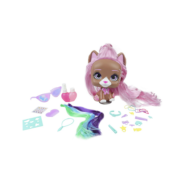 Набор VIP PETS порадует девочек, которым нравится заниматься созданием причесок. Собачки VIP Pets — это питомцы с длинными волосами. Питомцы любят посещать салоны красоты и делать новые укладки. Mega VIP Pet Nyla — самый большой щенок. В наборе представлены 30 аксессуаров, инструментов для укладки и окраски ее волос, воплощения различных модных идей. Длина распущенных волос 40см.