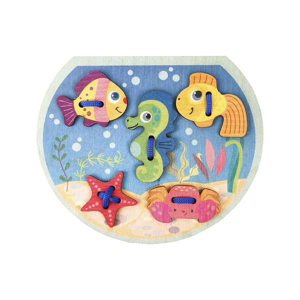 Шнуровка «Аквариум» относится к категории развивающих игр, она предназначена для детей в возрасте от 3-х до 6-ти лет. Цель игры – прикрепить с помощью шнуровки к «аквариуму» его обитателей – двух золотых рыбок, морского конька, морскую звезду и краба. В комплект входят фанерная доска, оформленная и раскрашенная в виде аквариума, деревянные фигурки обитателей, синий шнурок. Игра дает широкий простор для фантазии ребенка, развивает такие качества, как ловкость, внимательность, логику, способствует улучшению мелкой моторики рук. Ребенок с удовольствием займется размещением фигурок в игрушечном аквариуме, получит заряд положительных эмоций.
