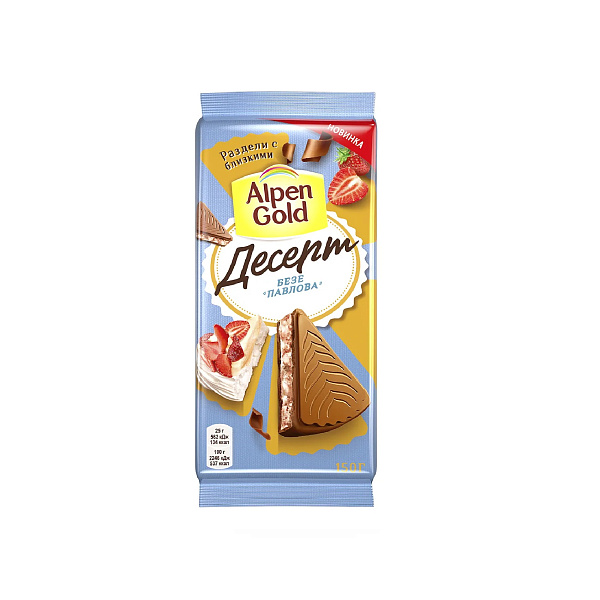 Для любителей необычных и нестандартных вкусов предназначен шоколад Alpen Gold клубника-безе. Вес плитки – 150 грамм. В этом шоколаде собраны вкусы клубники и безе Павлова в сочетании с молочным шоколадом. Безе Павлова – разновидность торта из меренги (белковой массы), взбитых сливок с кусочками фруктов или ягод. Для приготовления такого шоколада используется не только какао, но также клубничный экстракт и молочные продукты. Шоколадку можно сделать любимым десертом, а можно подарить другу или родственнику. Энергетическая ценность шоколада клубника-безе – 539 ккал на 100 грамм.