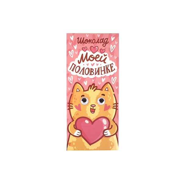 Плитка вкусного молочного шоколада, представленная в оригинальной упаковке, понравится каждому ребенку благодаря красочному дизайну: на нежном розовом фоне нарисован смешной кот, держащий в руках красное сердце. Нежный молочный шоколад приятно тает во рту и дарит яркое послевкусие какао. Насыщенная сладость шоколада еще долго будет преследовать ребенка, а красочная упаковка поднимет настроение.