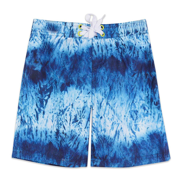 Эти яркие и стильные купальные шорты для мальчиков сразу обращают на себя внимание. Модель синего цвета до колена. Она окрашена в технике тай-дай и имеет необычный узор, полученный благодаря смешиванию нескольких оттенков. На поясе шорт вшита мягкая резинка, не дающая им сползти. А также у плавок есть завязки в виде шнурков, позволяющих отрегулировать посадку.
