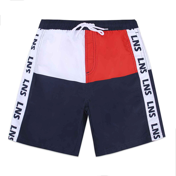 Купальные шорты для мальчиков выполнены в стильной цветовой блокировке, сочетающей красный, белый и темно-синий цвета. По бокам шорт расположены акцентные полосы с надписью, что придает изделию динамичный и современный вид.