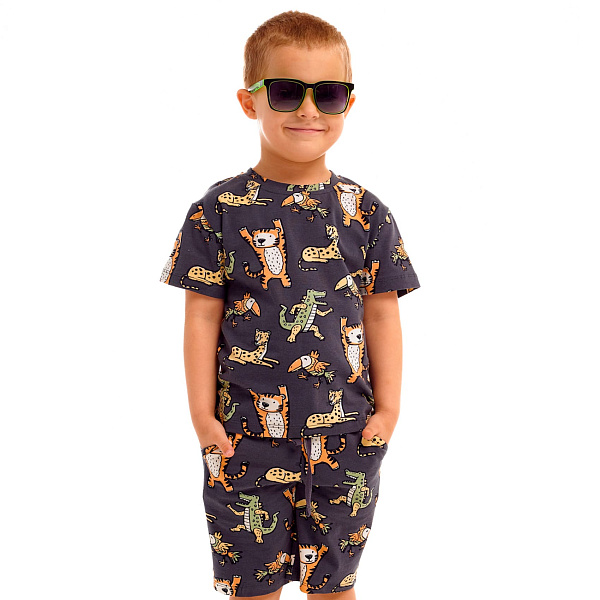 Удобные шорты для мальчиков на каждый день. Изготовлены из мягкого, приятного к телу, дышащего материала с добавлением эластана (95% хлопок, 5% эластан). Крой свободный, не ограничивающий движения во время активных игр, бега или катания на велосипеде. В этих шортах ребенку будет комфортно даже при высоких температурах воздуха на улице. Ткань серая с забавным рисунком в виде веселых зверят. На поясе широкая резинка и дополнительный ремень в виде шнурка.