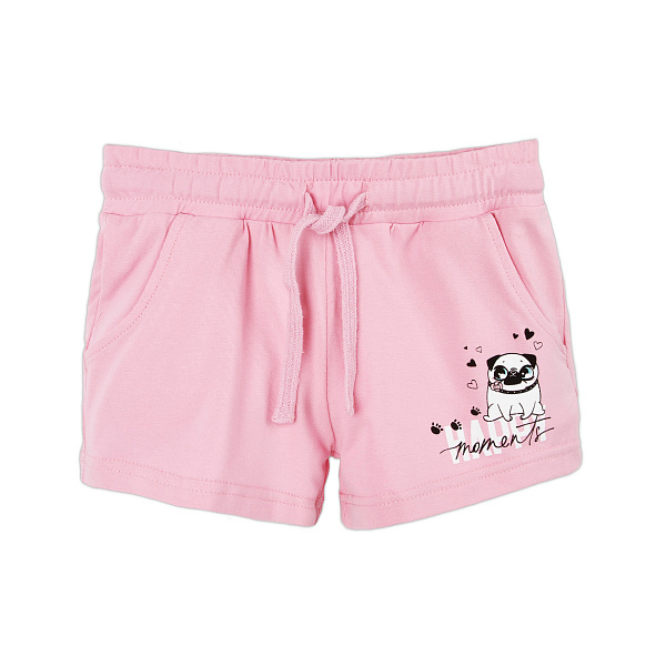 Яркие летние шорты для девочек розового цвета. Выпаленные их хлопковой ткани с примесью эластана (95% хлопок, 5% эластан). Они прекрасно подойдут для летней погоды. Материал дышащий, хорошо тянется. На ребенке модель сидит свободно, не мешая ему играть. Сбоку одну из штанин украшает рисунок в виде маленькой собачки породы мопс.