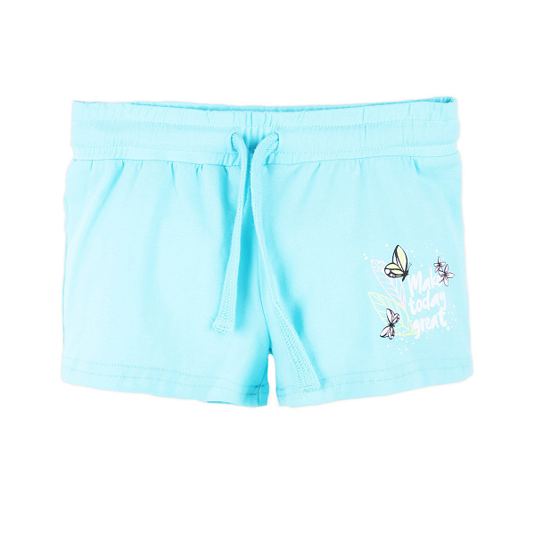 Шорты для девочки сшиты из хлопковой ткани, в которую было добавлено небольшое количество эластанового волокна (хлопок 95%, эластан 5%). Мягкий трикотаж приятен к телу, в нем комфортно даже в жаркие летние дни. Шорты классического кроя хорошо сочетаются с футболками подходящих оттенков. В таких шортах можно отправиться в детский сад, а также на прогулку во двор или в парк. Шорты светлого бирюзового цвета на левой штанине украшены рисунком с бабочками, цветами и мотивирующей надписью на английском языке. В широкий пояс вшита кулиска со шнурком бирюзового цвета, которым можно затянуть пояс по талии девочки. Низ обеих штанин обработан фабричным швом.