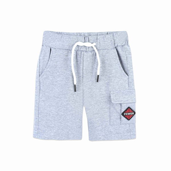 Удобные повседневные шорты для мальчиков серого цвета. У них свободный крой, не стесняющий движения. Материал мягкий и удобный в носке. По бокам два обычных кармана и один накладной с объемной наклейкой на нем. На поясе широкая резинка и ремешок в виде белого шнурка.