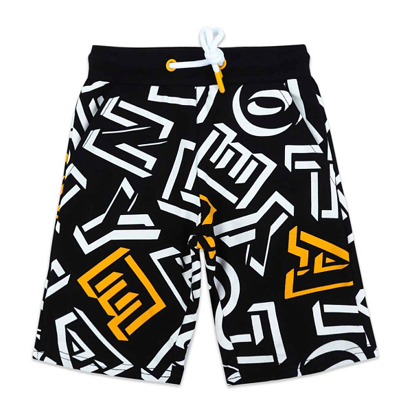 Шорты отличаются нестандартным и модным цветовым оформлением: на черном фоне изображена композиция из геометрических узоров белого и оранжевого цветов.