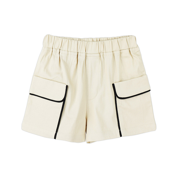 Широкая резинка на поясе хорошо держит шорты на талии ребенка. Низ широких коротких штанин обработан фабричным швом. Изюминкой модели стали большие накладные карманы, расположенные по бокам передней части. Карманы оторочены контрастной черной лентой и имеют декоративные клапаны.