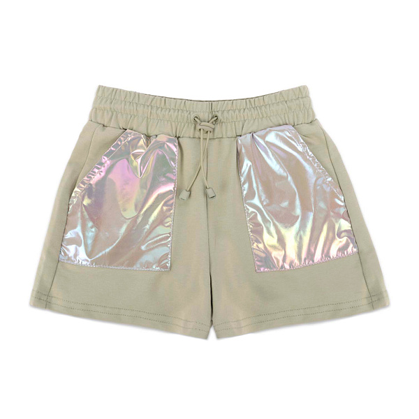 Изделие имеет широкие штанины, которые не стесняют движения и обеспечивают естественный воздухообмен. Креплением выступает широкая эластичная резинка, дополненная утягивающим шнуром. Особенностью модели являются большие накладные карманы с блестящей поверхностью, поэтому шорты как бы сверкают на ярком солнце. Удобство, гигиеничность и нестандартность – основные качества этого изделия.