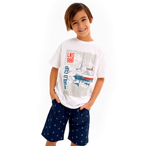 Легкие шорты для мальчиков на лето. Выполненные из натурального материала, они хорошо пропускают воздух и выводят лишнюю влагу. Ткань (100% хлопок) плотная, хорошо держит форму. Модель темно-синего цвета с морским принтом в виде маленьких якорей. Будет хорошо смотреться и с классическим, и со спортивным стилями в одежде.
