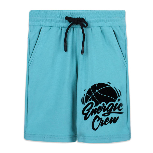 Классические трикотажные шорты для мальчиков в спортивном стиле. Изделие насыщенного голубого цвета с рисунком на одной из штанин. У нее свободный крой. На поясе пришита широкая и эластичная резинка, которая не доставляет дискомфорта в процессе носки. Откорректировать размер можно также с помощью завязок в виде шнурков. По бокам предусмотрены карманы для разных мелочей.