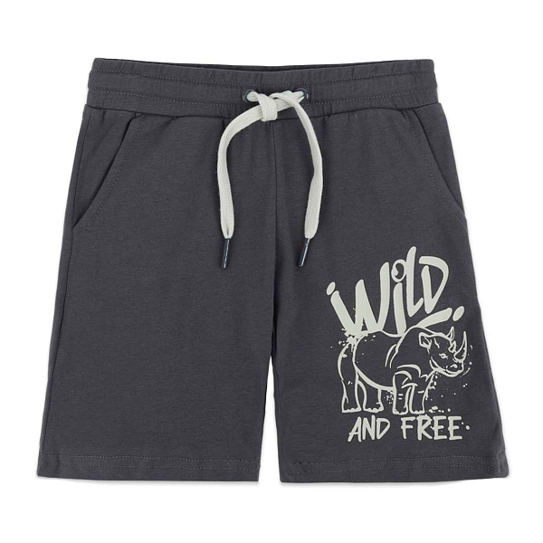 Детские трикотажные шорты для мальчиков в спортивном стиле. Изделие темного серого цвета с контрастным белым рисунком в виде носорога на штанине. У модели свободный крой, который никак не ограничивает движения ребенка. На поясе порт пришита широкая резинка. Она не давит на живот и не мешает кровотоку. Ремешок в виде шнурка позволяет дополнительно регулировать посадку.