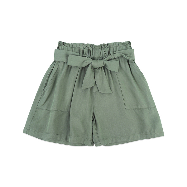 Легкие шорты для девочки сшиты из вискозы насыщенного зеленого цвета. Свободный крой штанин не стесняет движений. Верх на широкой резинке дополнительно украшен поясом, продетым в шлевки по всей талии. Его можно завязать в красивый бант, что сделает шорты еще более элегантными.