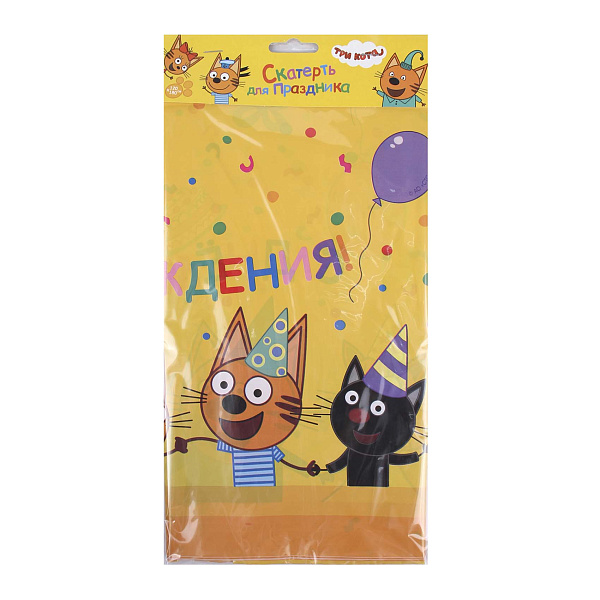 Скатерть украшена изображениями котиков из любимого мультфильма "Три кота", что привносит радость и веселье в атмосферу праздника. Это изделие идеально подходит для детских дней рождения и тематических вечеринок, где важно создать ощущение праздника и волшебства.