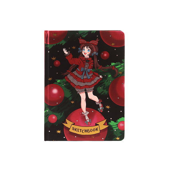 Скетчбук послужит самостоятельным презентом или дополнением к основному подарку. Дизайн обложки ориентирован на фанатов аниме, в основе оформления – новогодняя тематика. Замысел поддержан актуальной цветовой гаммой.