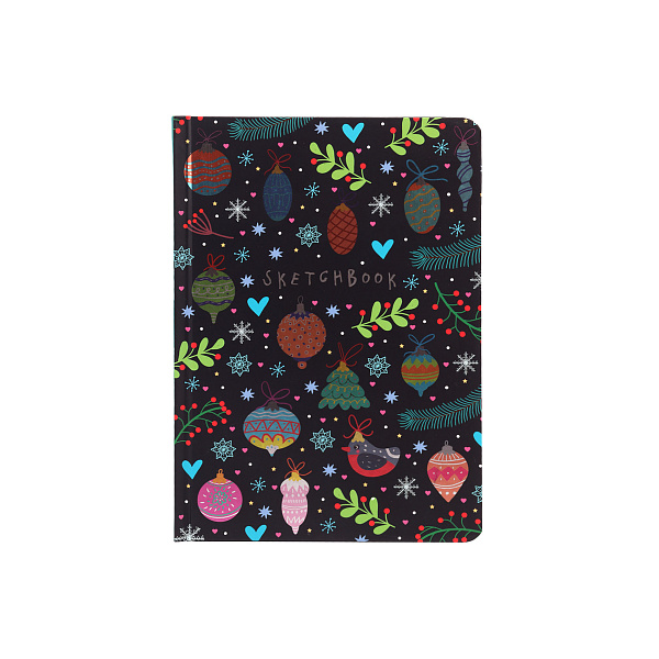 Приятным и полезным презентом к новогодним праздникам станет скетчбук с тематическим дизайном. Обложка украшена изображениями елочных игрушек, оформленных в ярких цветах. Они выгодно контрастируют с темным фоном. Закругленные края делают продукцию более комфортной и безопасной.