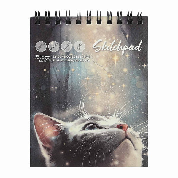На обложке блокнота изображена очаровательная кошка. Внутри блокнота 30 листов черной бумаги плотностью 120 г/м², которая отлично подходит для рисунков белым и цветным гелевыми ручками, металлическими маркерами или мелками. Черный цвет бумаги создаёт особый эффект, делая рисование более увлекательным и результативным.