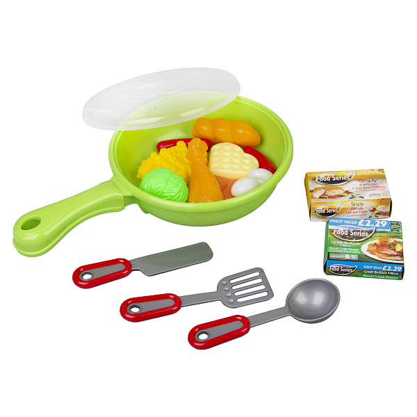 Кухонный набор для игры в кухню понравится каждой маленькой хозяйке! Игры с посудкой развивают интерес ребенка к готовке, воображение и трудолюбие. В набор входит сковородка, поварешка, лопатка, нож, мясные полуфабрикаты, грибы, картофель фри, вафли. Вся посудка выполнена в красочном цвете, ее можно компактно хранить в домашних условиях или же носить с собой в гости и на прогулку.