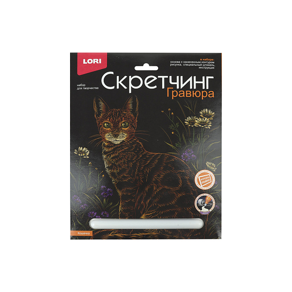 Принцип создания скретч-картин прост – нужно аккуратно сцарапать специальным стилусом или ручкой-пером серебристое покрытие с винилового листа. В результате получается красивое разноцветное изображение котенка на темном фоне. В комплект входит подробная инструкция, которая поможет все сделать правильно.