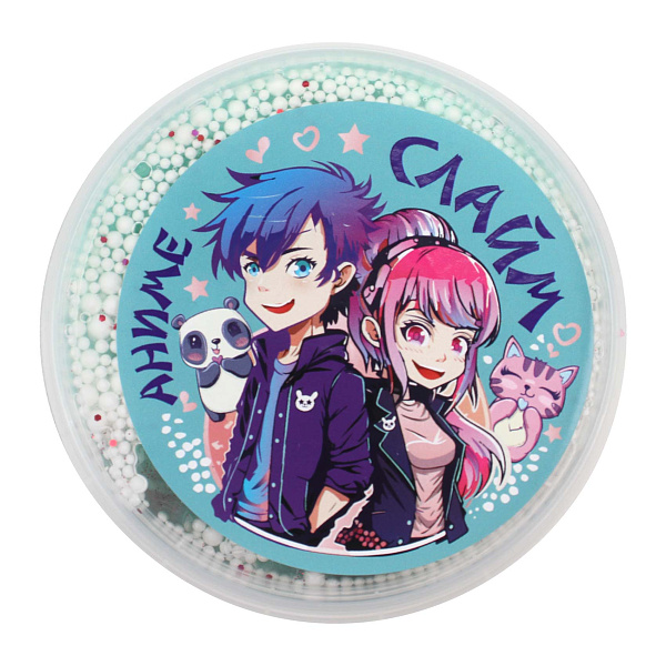 Слайм «Аниме» представлен ярким бирюзовым цветом с блестками и белыми пенопластовыми шариками, что делает игру с ним особенно интересной и привлекательной. Слайм помогает снять напряжение и облегчить состояние, связанную с усталостью.