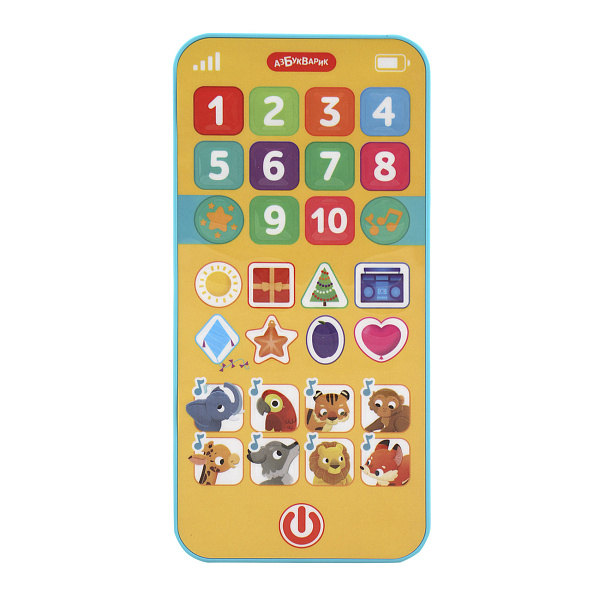 Смартфончик предлагает режимы: «Умняшка», «Песенки-загадки» и «Веселые задачки». Кнопки с изображениями животных и цифр помогают изучать числа, цвета, формы и звуки в игровой форме. При повторном нажатии песенка прекращает звучать, что позволяет контролировать процесс.