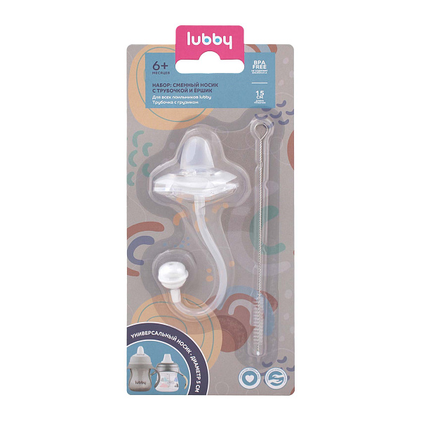 Сменный носик к поильнику «Lubby» с трубочкой и ершиком предназначен для детей от 6 месяцев и подходит ко всем поильникам этой марки с мягким силиконовым носиком диаметром 5 см. Трубочка длиной 15 см оснащена грузиком на конце, что позволяет пить из поильника под любым углом, не наклоняя его слишком сильно.